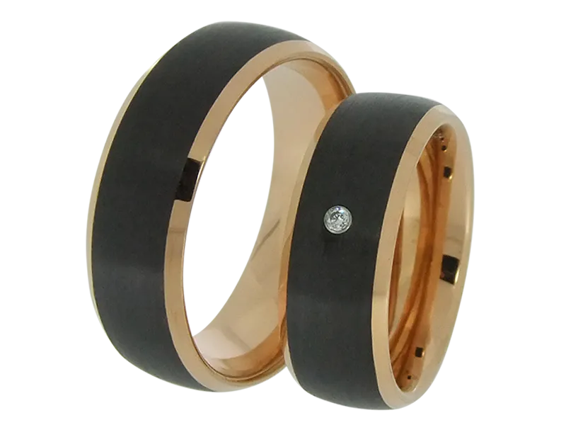 Diese modischen und zeitlosen Ringe bestehen aus massivem, innen rosèvergoldetem Wolfram. Die Außenseite ist mittig schwarz und an den Seiten rosèvergoldet. Der